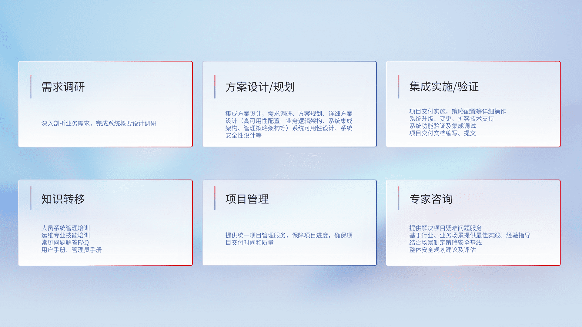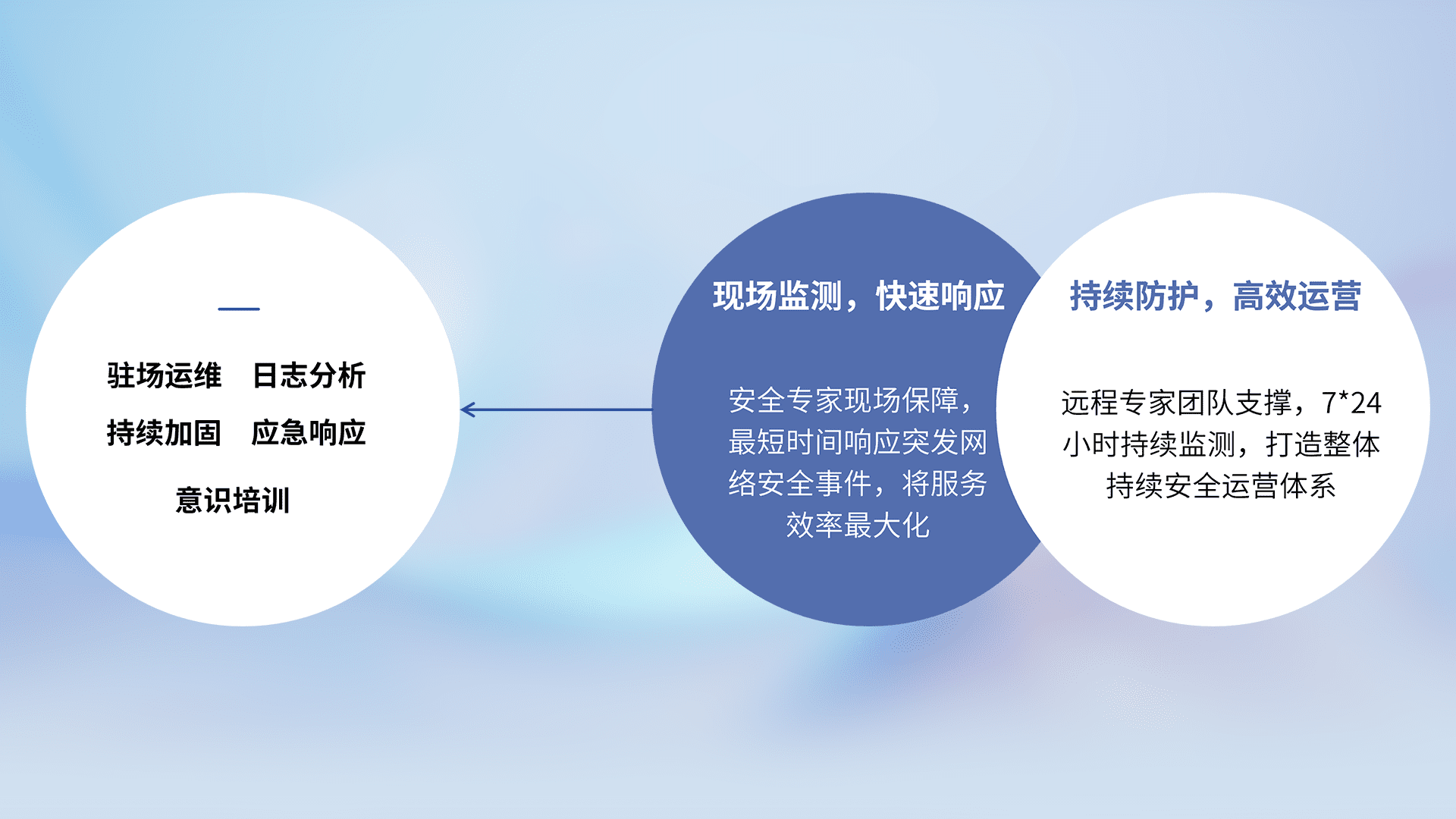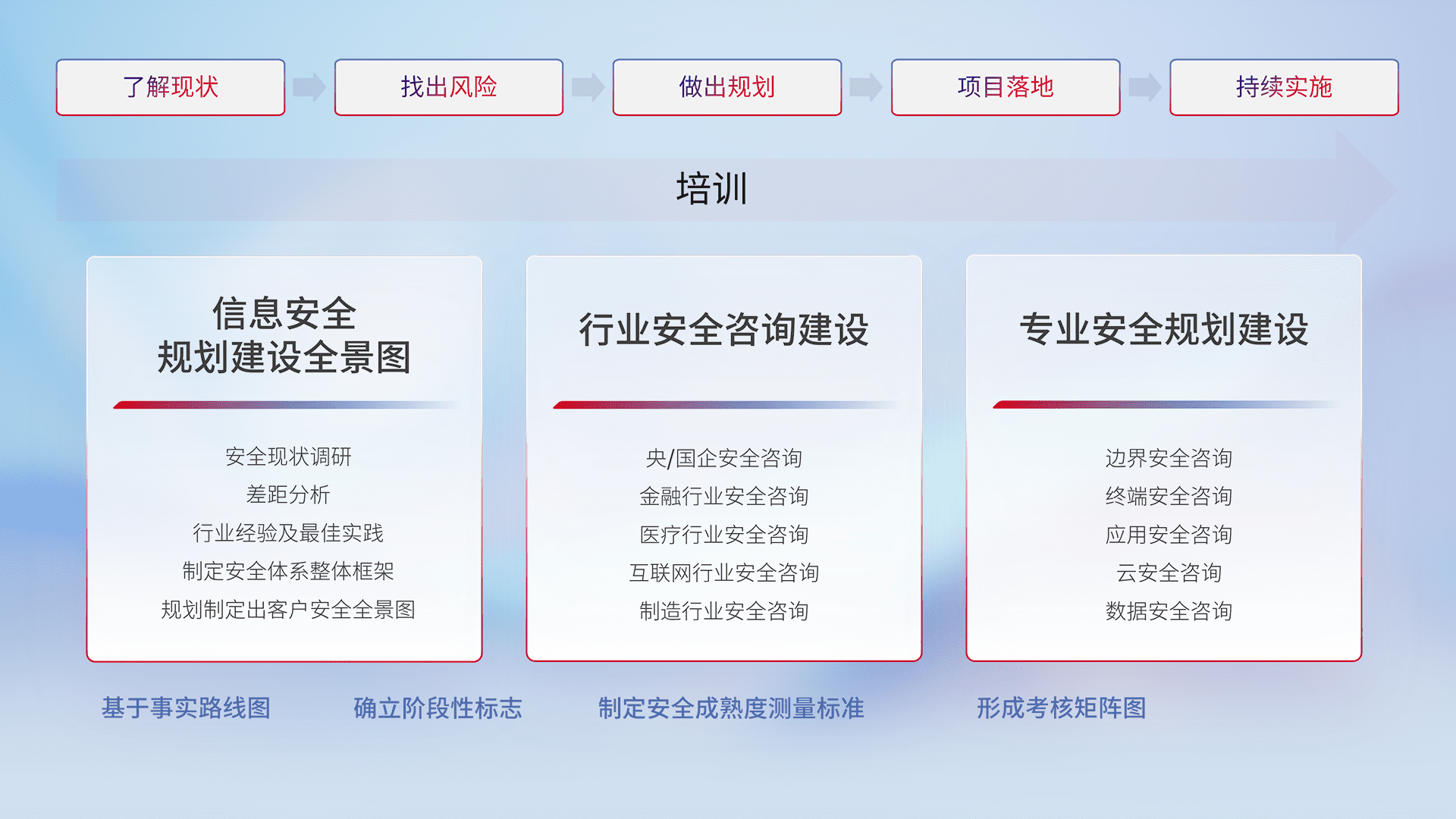 针对客户行业特性,以“专业的安全服务+多厂商联合解决方案”提供专属的一站式安全管理服务,帮助客户全面感知网络空间威胁,基于识别、检测、分析、防护、监测、响应的服务理论模型,从方案咨询、集成交付、评估验证、优化加固、运维运营,致力于为客户提供完整的闭环管理式安全服务。以实战经验为客户打造高抵御风险的安全体系,帮助客户发现威胁、对抗威胁、处置威胁,不断积累安全对抗能力,持续保障数字化安全。